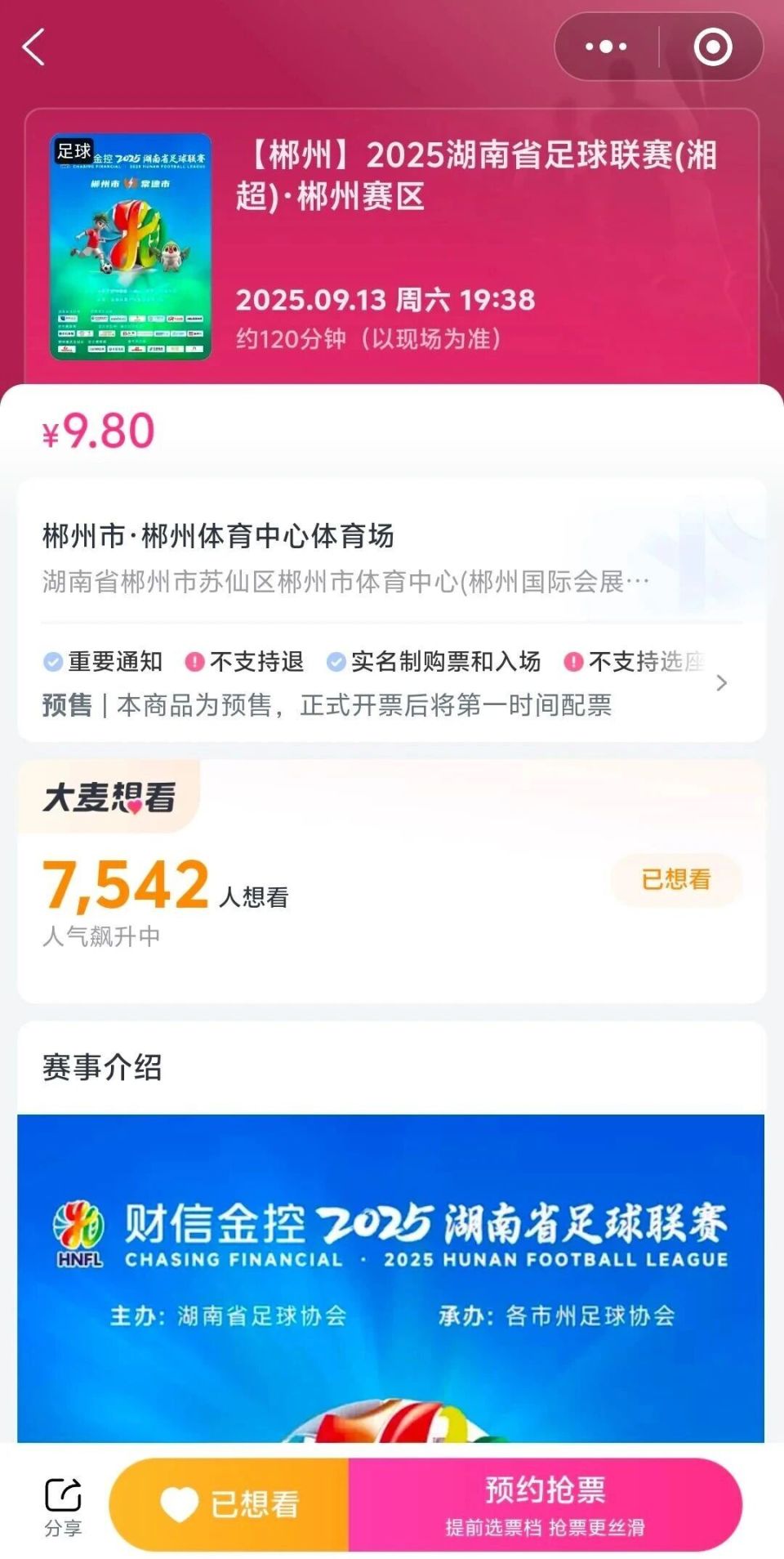 常德VS郴州!今天14:18分大麦网抢“湘超”门票
